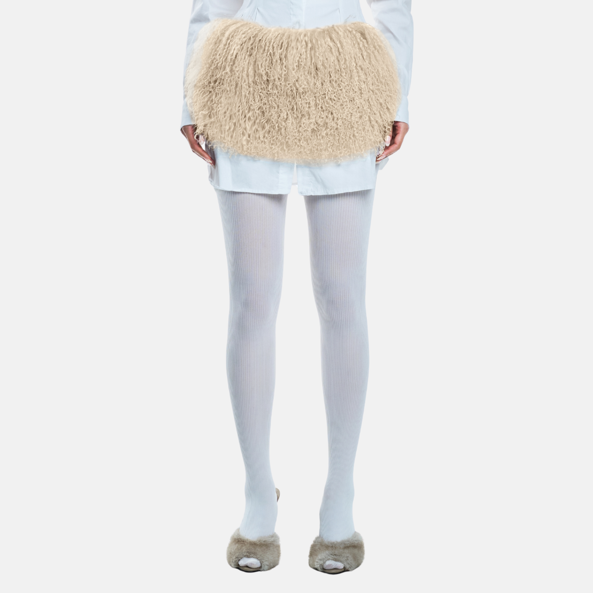 • The THEA Mini Skirt redefines statement dressing with its daring silhouette and tactile luxury. Crafted from genuine Tibetan lamb fur at the front and back, it’s elevated by lace-up side panels on both sides, revealing subtle glimpses of skin while adding a modern edge.