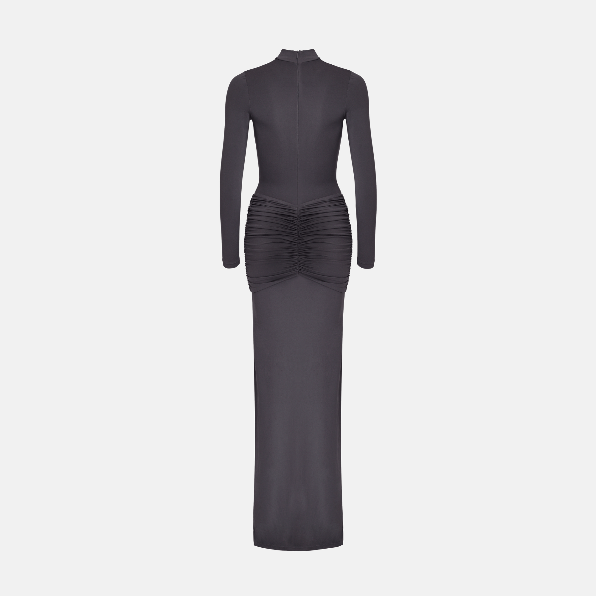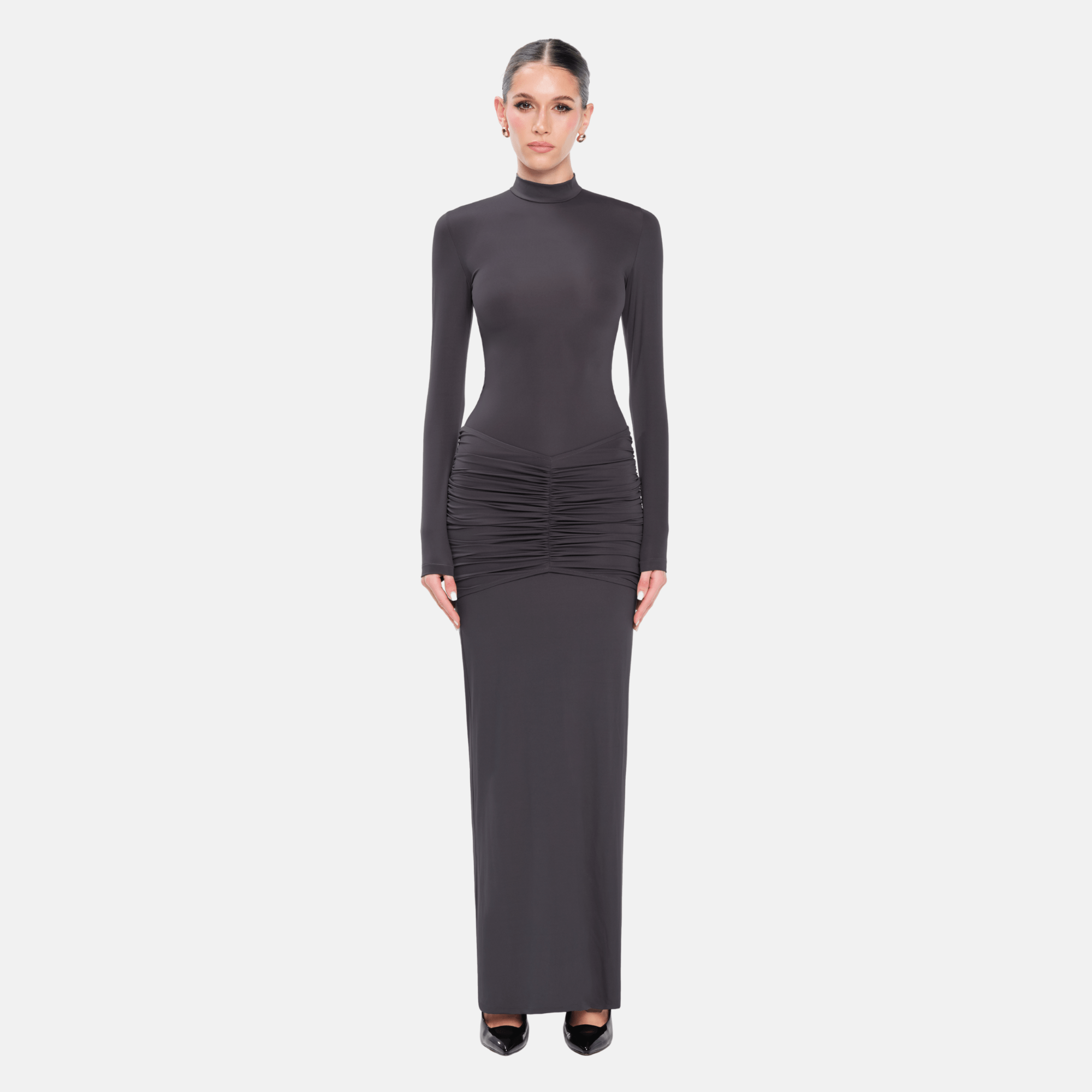 The CELIA Maxi Dress brings modern minimalism and sculptural elegance together in one seamless silhouette. Crafted from a soft, stretchy material, this long-sleeved dress gently hugs the body, accentuating the figure with strategically placed ruching at the waist and hips. The high neckline and floor-length cut lend a sophisticated touch, while the subtle detailing adds a refined edge.