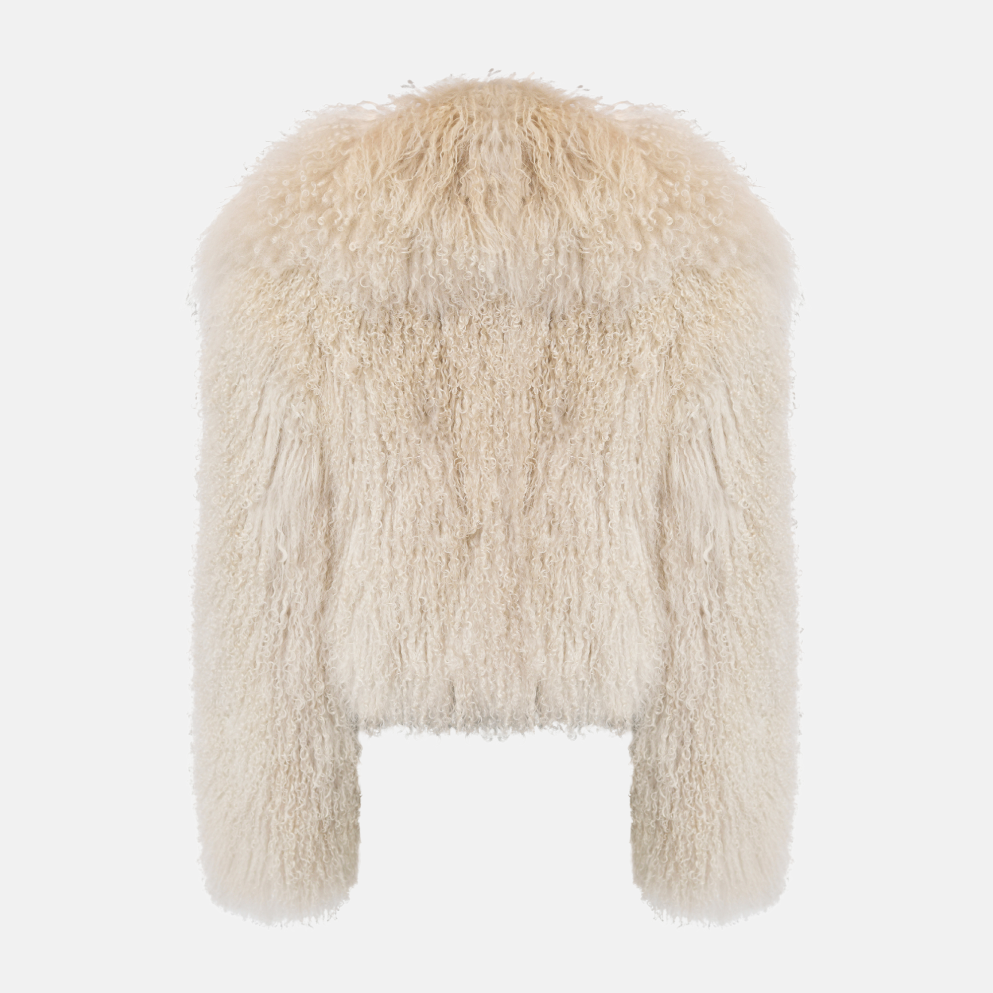 • The THEA Fur Jacket is the epitome of modern luxury. Crafted from genuine Tibetan lamb fur, it features a sumptuous oversized collar and voluminous sleeves that exude sophistication. Its slightly cropped silhouette lends a contemporary edge, balancing dramatic texture with refined tailoring.