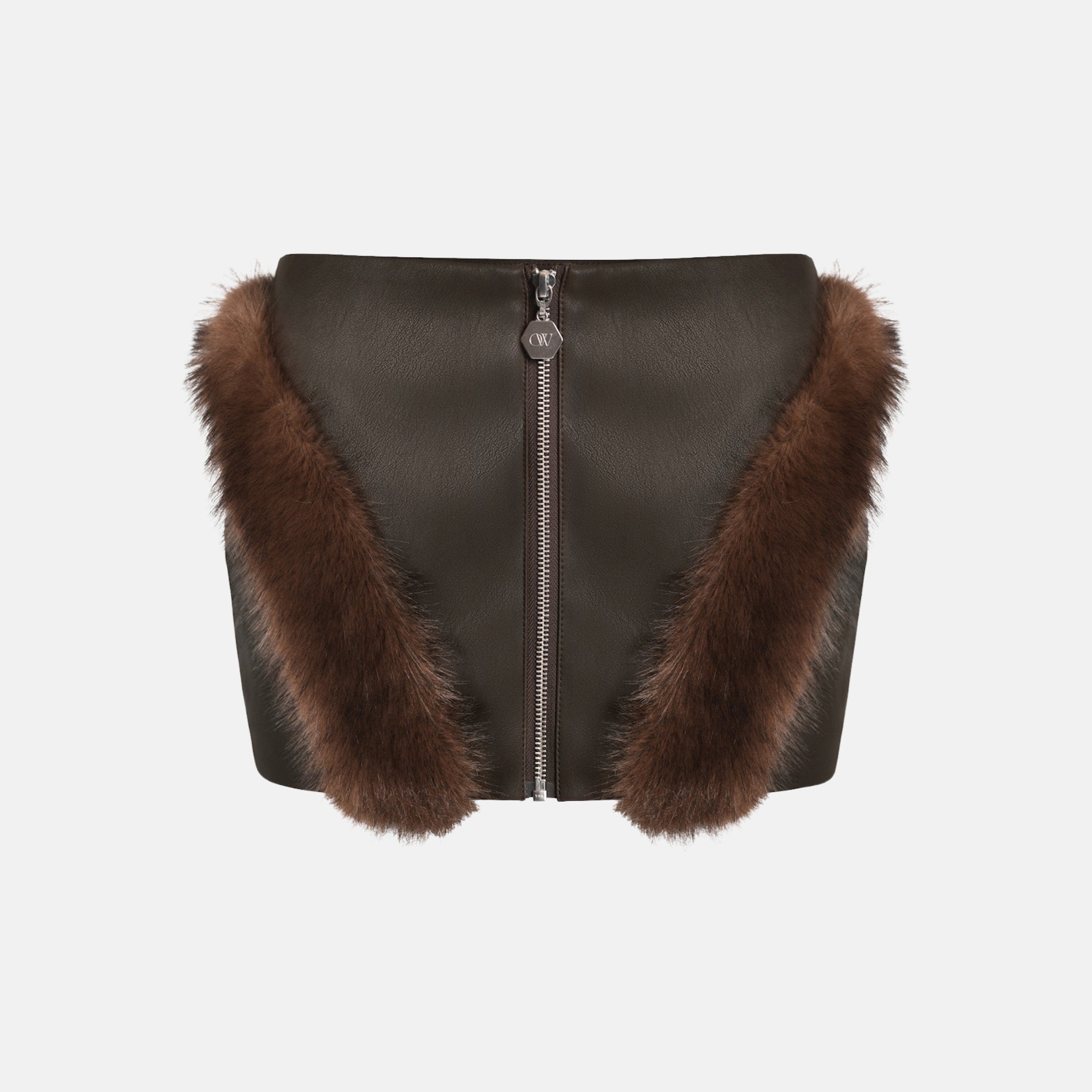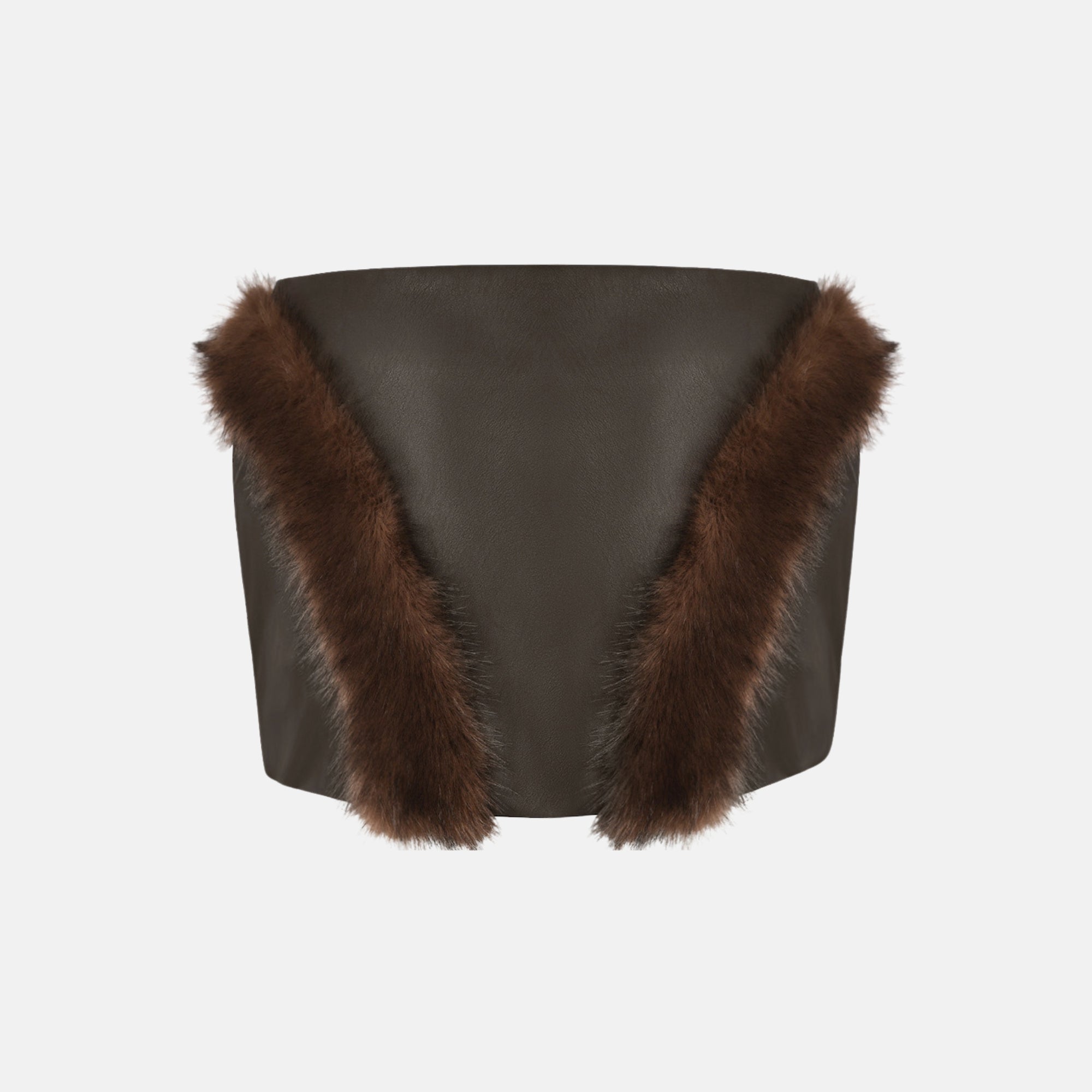 • BELA Mini Skirt is a bold, statement-making piece defined by texture and contrast. Crafted in faux leather with sculptural faux fur detailing, the skirt delivers a sharp, confident silhouette with strong visual impact.
