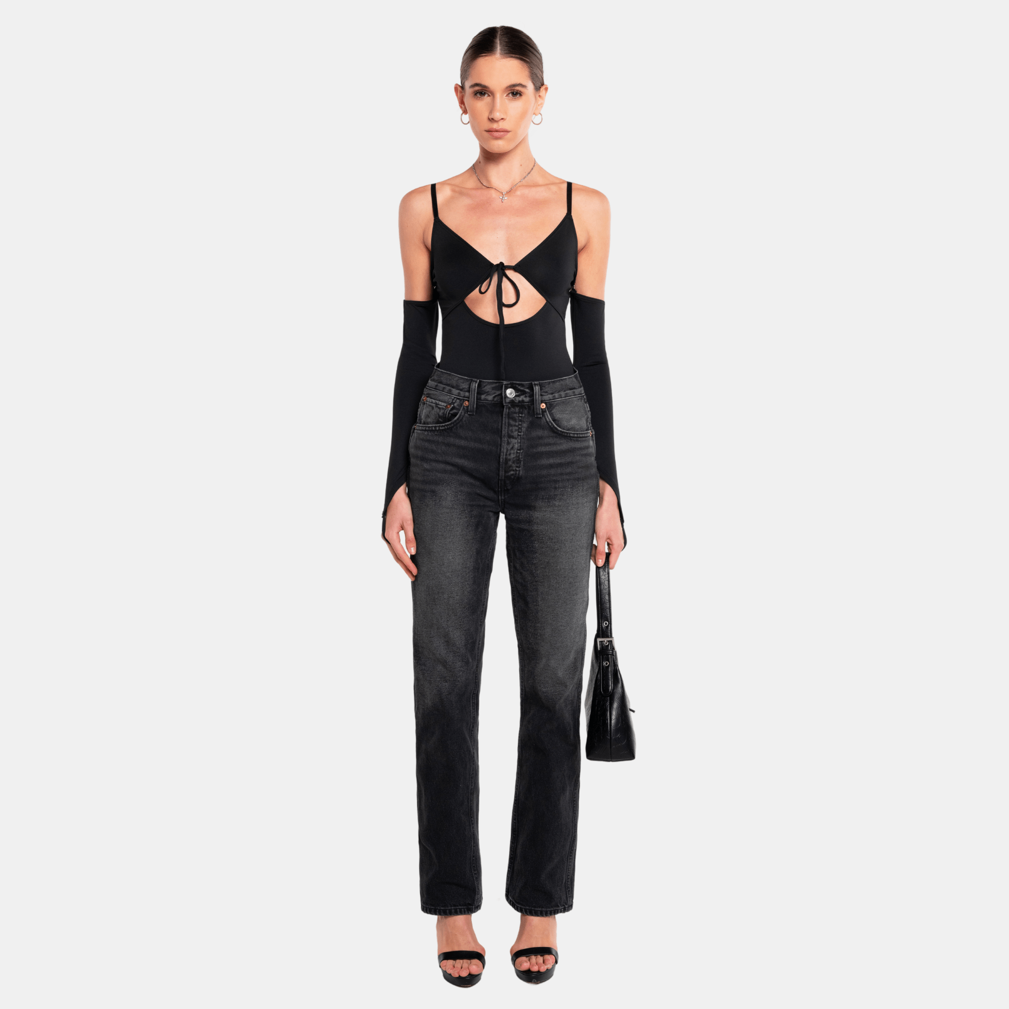 • The MATILDA Bodysuit is a cute and versatile piece that features a front tie and detailed sleeves. Whether paired with a skirt or pants, it's perfect for a night out.