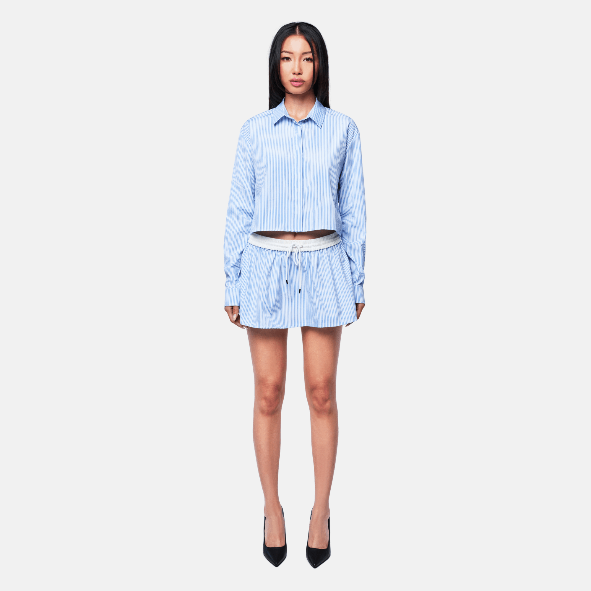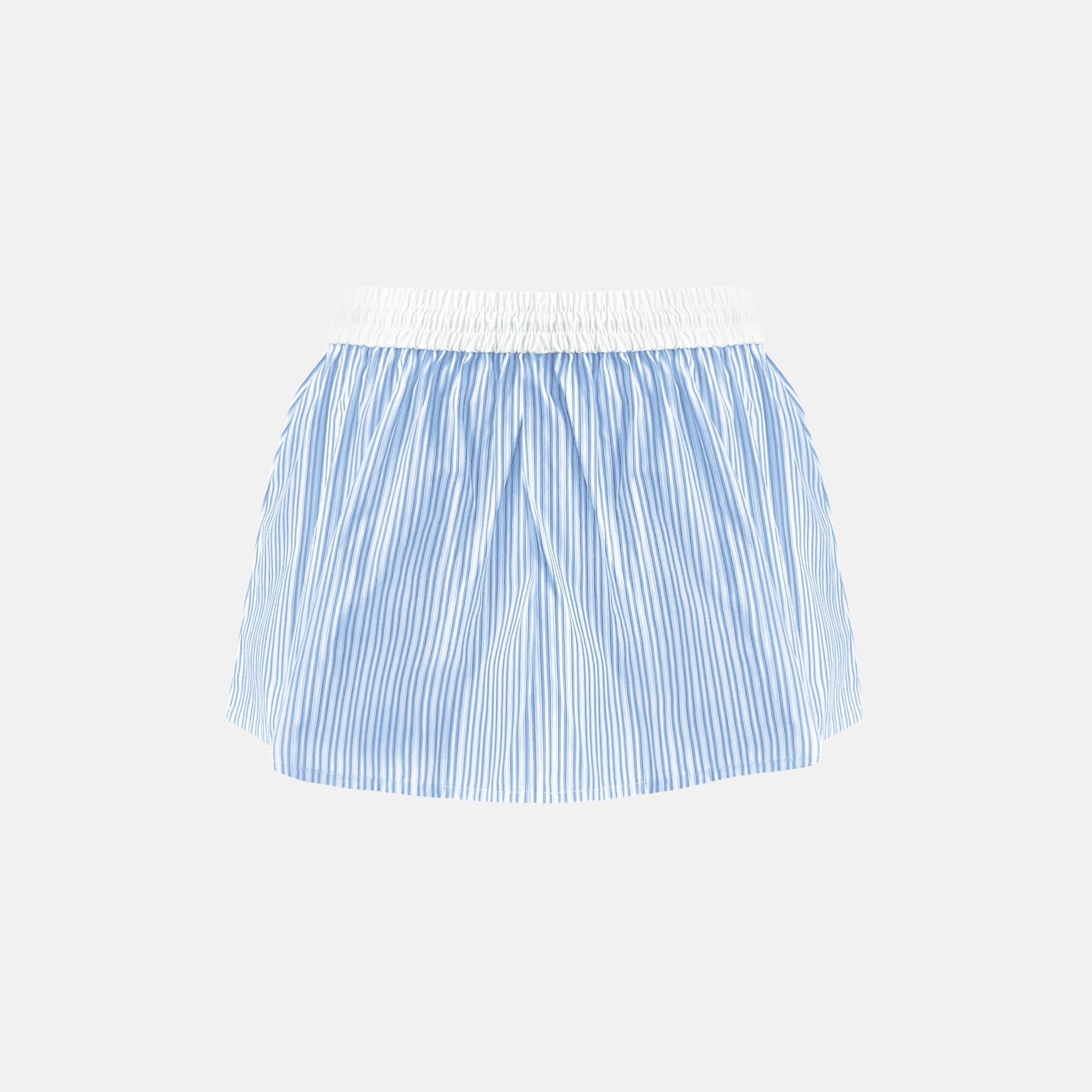 • The ELLA Mini Skirt offers a fresh take on classic shirting. Cut from light blue striped cotton with a contrasting waistband and adjustable drawstring, it blends comfort with effortless style. The mini length and details give it a playful edge that works for any occasion.