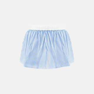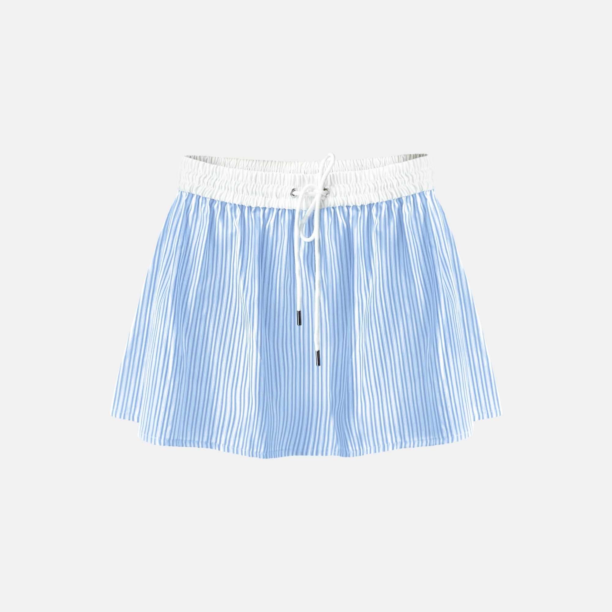 The ELLA Mini Skirt offers a fresh take on classic shirting. Cut from light blue striped cotton with a contrasting waistband and adjustable drawstring, it blends comfort with effortless style. The mini length and details give it a playful edge that works for any occasion.