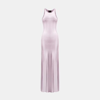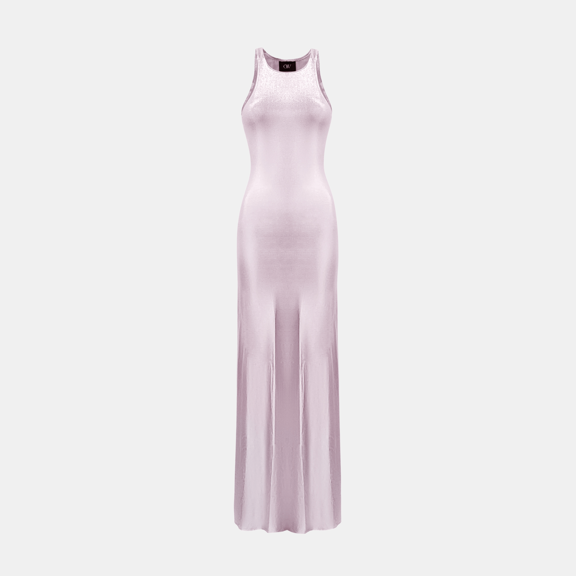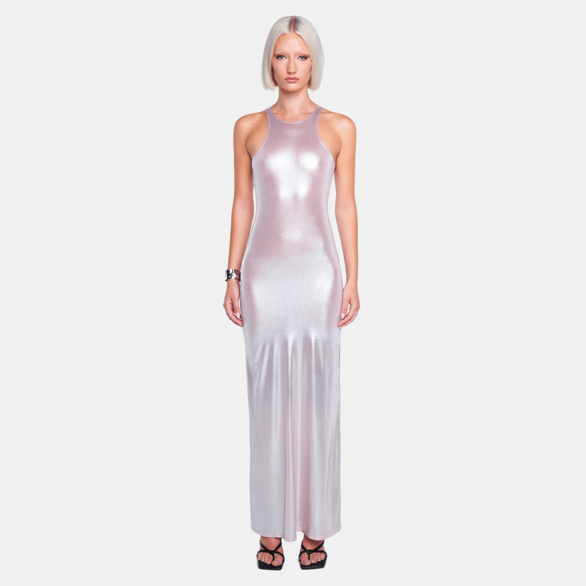 • The NINA Maxi Dress is a statement in simplicity. Crafted in a liquid-effect fabric, it features a high neckline, racer-style cut, and a floor-length silhouette that skims the body. The high-shine finish moves with the light, giving the dress a sleek, fluid feel from every angle.