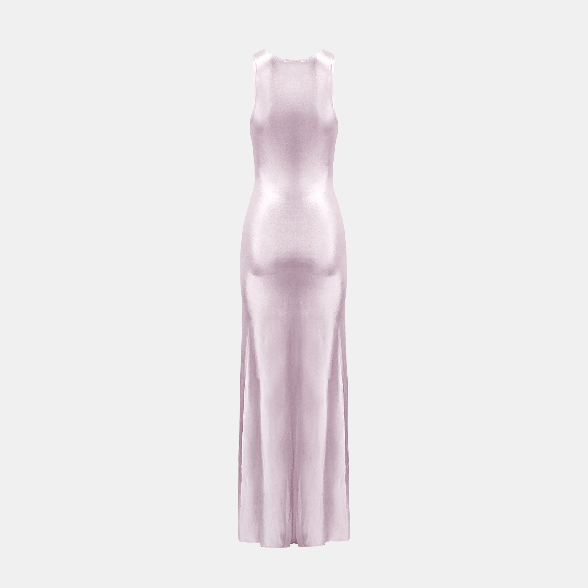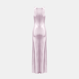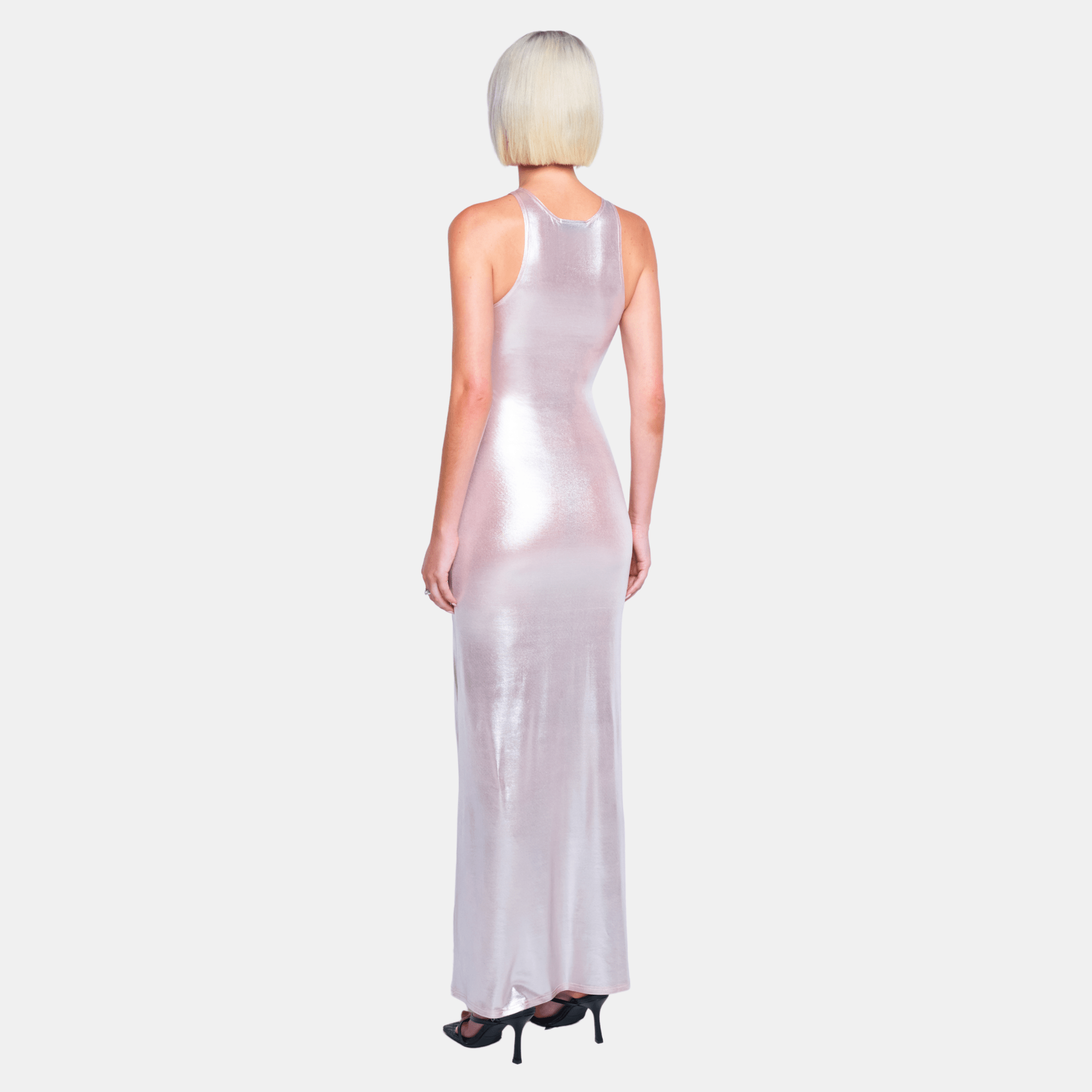 The NINA Maxi Dress is a statement in simplicity. Crafted in a liquid-effect fabric, it features a high neckline, racer-style cut, and a floor-length silhouette that skims the body. The high-shine finish moves with the light, giving the dress a sleek, fluid feel from every angle.