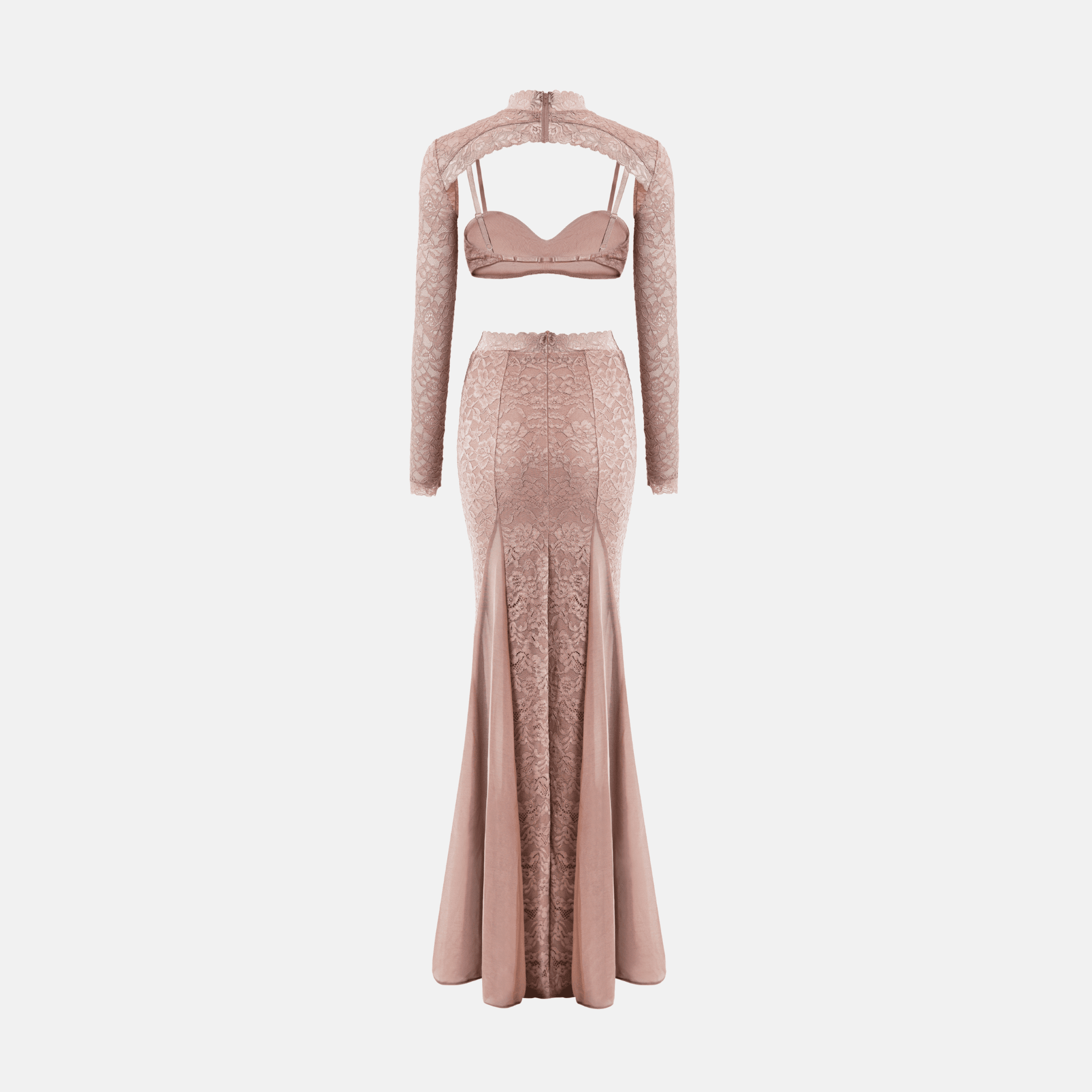 NAIA Maxi Dress is a statement set defined by structure, lace, and intentional layering. The look consists of a fitted maxi skirt, a sculpting bandeau top, and a separate long-sleeve lace overlay, creating a balanced silhouette that feels confident and considered. Designed for elevated occasions, NAIA highlights the body with precision while maintaining a refined, composed expression.