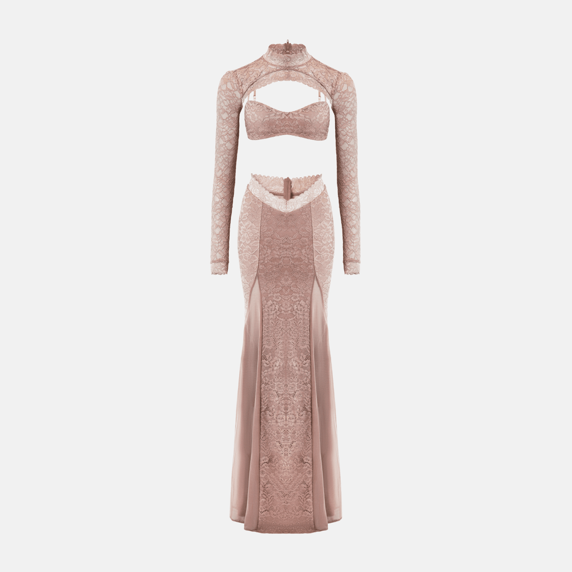 • NAIA Maxi Dress is a statement set defined by structure, lace, and intentional layering. The look consists of a fitted maxi skirt, a sculpting bandeau top, and a separate long-sleeve lace overlay, creating a balanced silhouette that feels confident and considered. Designed for elevated occasions, NAIA highlights the body with precision while maintaining a refined, composed expression.